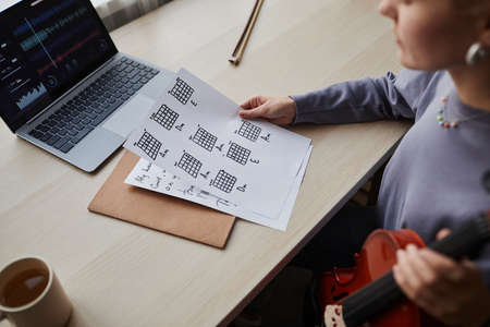 Close up of young woman holding music sheet while composing at home with violin