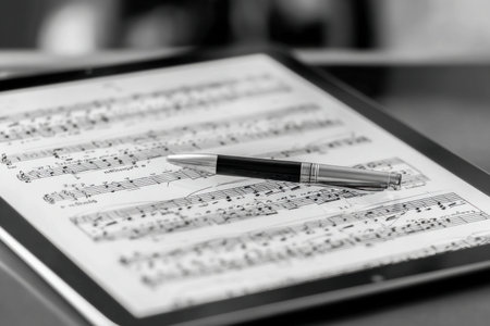 A printed score sheet is elegantly placed on a tablet, accompanied by a stylish pen, highlighting musical notes and creating an inspiring atmosphere for creativity