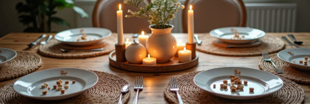 Cozy candlelit dinner table setting with elegant tableware and rustic decor. That the image is generated using AI.