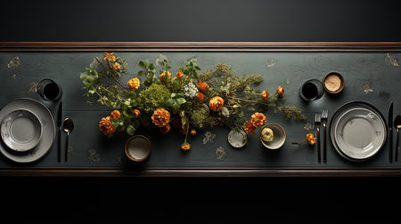 dishes and table details, such as cutlery, decorative plates and flowers, highlighting exquisiteness and attention to detail generative ai