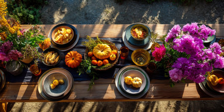 Autumn outdoor table setting with pumpkins, flowers, and rustic dishes creating warm and festive atmosphere in natural light