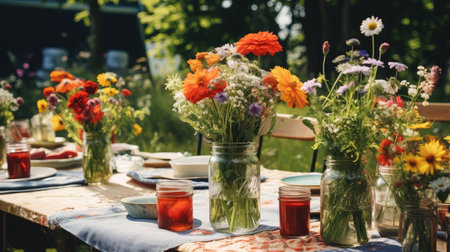 A beautifully set table in a garden, featuring floral arrangements, glasses, and dinnerware, creating a festive atmosphere for a summer gathering.