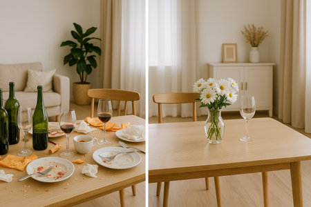 A beautifully arranged dining table set for a special occasion, featuring elegant plates, napkins, and decorative flowers, perfect for celebrations.
