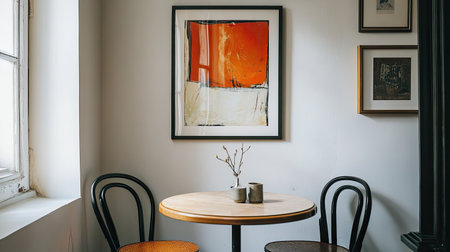 A wooden dining table is simply decorated with a ceramic mug and two small potted succulents, bathed in natural light from a window with blinds. A framed abstract print on the wall completes the clean, modern interior vignette.