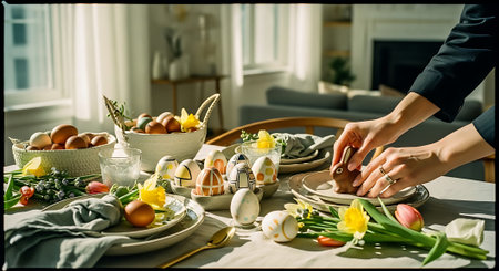 A beautifully set Easter table with flowers and decorated eggs in a bright dining room