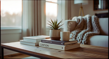 A serene living room setting with a wooden table featuring a cup of coffee, a stack of books, and a potted plant, surrounded by comfortable furniture and soft lighting.