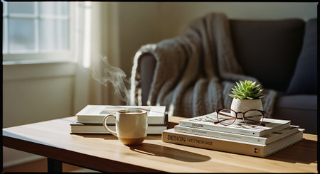 A serene living room with a steaming cup of coffee, open books, glasses, and a small potted plant on a wooden table. A cozy couch with blankets in the background.