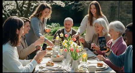 A cheerful group of friends gathered outdoors for brunch, with colorful drinks, flowers, and a camera capturing the moment.