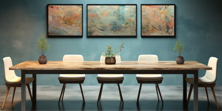 three oversized framed pictures, in the style of atmospheric clouds, hang on the wall above a wooden table. the dark beige tonalist color scheme and naturalistic rendering create a captivating ambiance. captured with an 8k resolution using a hasselblad 500cm, the layered imagery adds depth and complexity to the composition, subtly infused with irony. ai generated