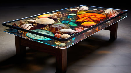 reflection of empty room on shiny tabletop, with blurred reflections, created with generative ai