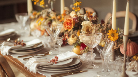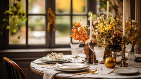 Elegant rustic dining table with autumn centerpiece and warm lighting. That the image is generated using AI.