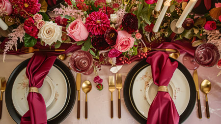 A table with a fancy dinner setting and flowers on it, AI