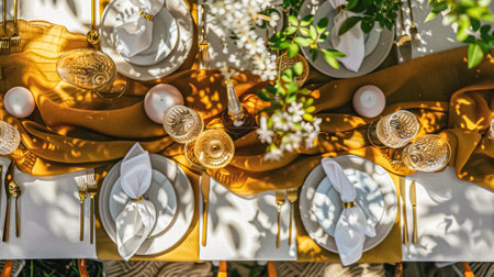 A well-lit, top-down view showcases a table set for a formal event. The composition features white plates, sparkling glassware, and decorative greenery and candles. The scene suggests a sophisticated ambiance, with textures of fabric and wood. Suitable for various editorial and commercial applications.
