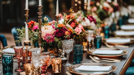 Elegant candlelit banquet table with floral centerpieces and fine tableware in lavish setting. That the image is generated using AI