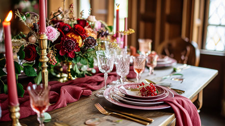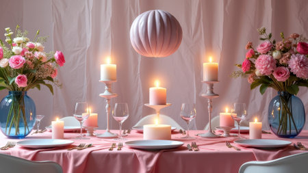 Elegant candlelit dinner setting with pink flowers and elegant tableware. That the image is generated using AI.