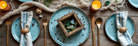 Rustic table setting with blue plates and candles for a cozy dining experience. That the image is generated using AI.