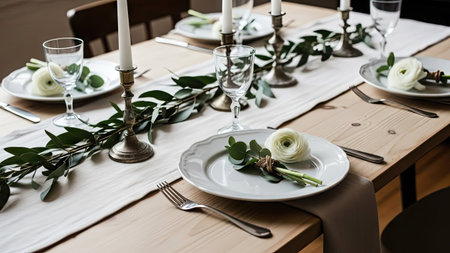 An inviting table setting features white plates, gold cutlery, and glasses arranged on a light-colored wooden table. A decorative garland of green leaves and white flowers adorns the table. The image has soft lighting and a blurred background, suggesting a cozy indoor dining environment suitable for various commercial uses.