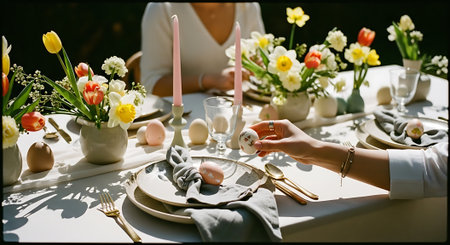 A beautifully set Easter table with flowers and eggs in a bright room