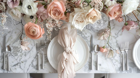 Sophisticated dining table with a marble surface, silver cutlery, and a chic arrangement of seasonal flowers and elegant napkins