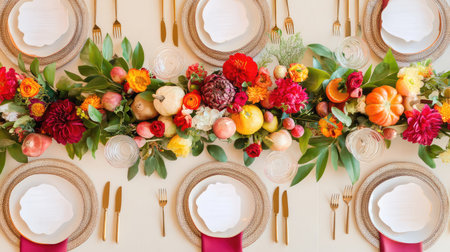 This image captures an elegant autumn table setting adorned with colorful flowers and fresh fruits, complemented by gold tableware, perfect for festive gatherings.