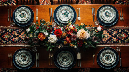 dishes and table details, such as cutlery, decorative plates and flowers, highlighting exquisiteness and attention to detail generative ai