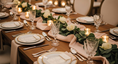 Celebration wedding table with setting and decor, expensive tableware, wedding or anniversary party, postcard and invitation card