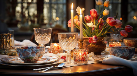 Candlelit Easter Dinner: A dining table set for an intimate Easter dinner with softly lit candles, creating a warm and inviting atmosphere for a memorable celebration.