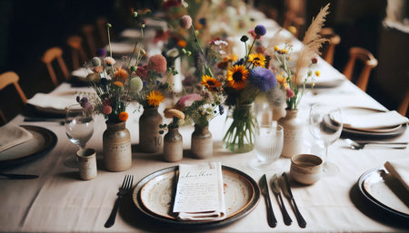 Colorful flowers in vases create a lively focal point on the rustic wooden table. The setting invites warm gatherings around elegantly set plates and glasses in a cozy atmosphere.