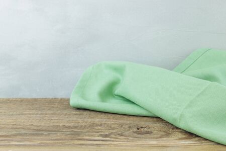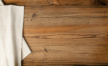 Kitchen towel or napkin over the rustic wooden table. View from above with copy space