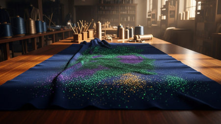 Close up colorful fabric and thread catalog on Seamstress or dressmaker work table and clothes background.
