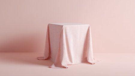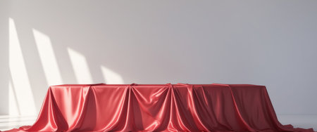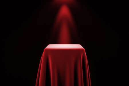 Presentation pedestal covered with a red silk cloth in front of a wall illuminated by a spot light