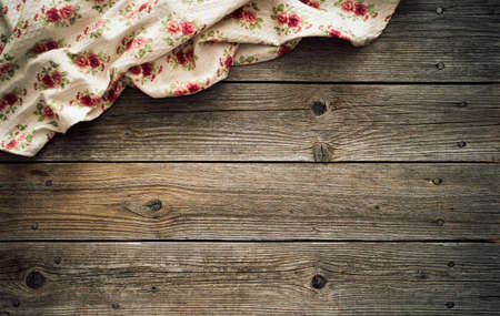 Vintage kitchen tablecloth on rustic wooden table made of rough old wood planks. Textured background with copy space for your advertising text message or promotional content.