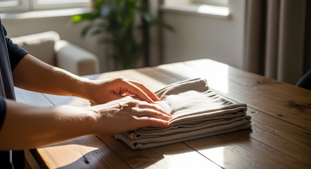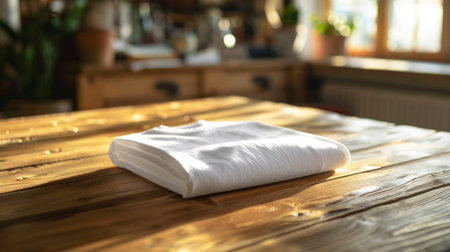linen napkin on a wood table closeup with evening sunlight