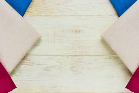 close up of cloth napkins of beige, blue and burgundy colors on rustic white wooden table. Shallow depth of field.