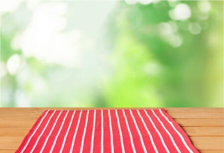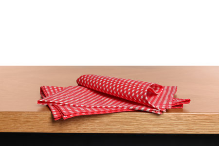 Checkered tablecloth on wooden table against white background