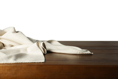 Light tablecloth on wooden table against white background, closeup