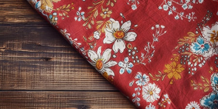 Red fabric lies on the table. Material to cover the table. Tablecloth on the face. A folded piece of red matter. The fabric is crutly.