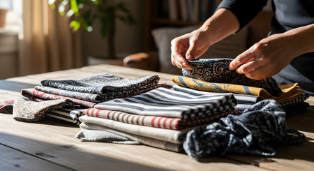 heap of cloth fabrics on wooden table
