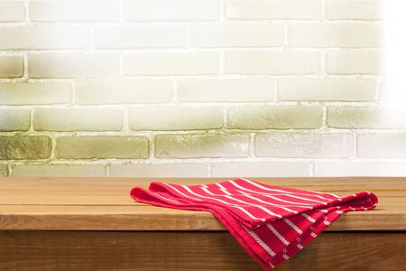 Background with wooden table, tablecloth and grunge red wall