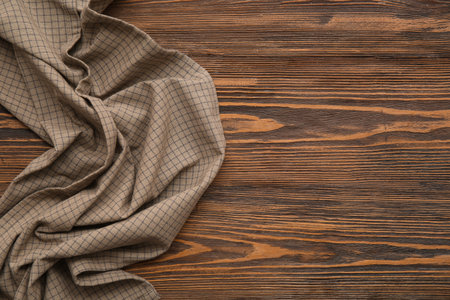 gray kitchen towel on brown wooden background, top view, copy space