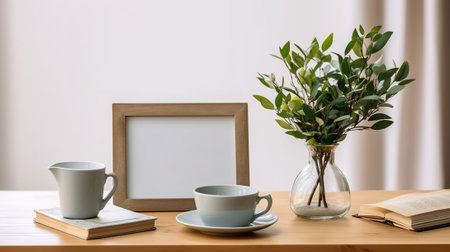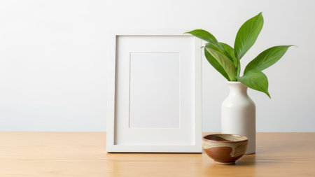 A simple and elegant setup featuring a white picture frame next to a small vase holding green leaves, placed on a wooden surface with a small bowl nearby.