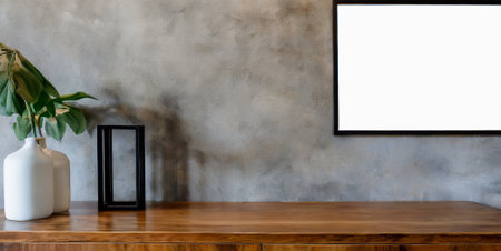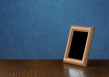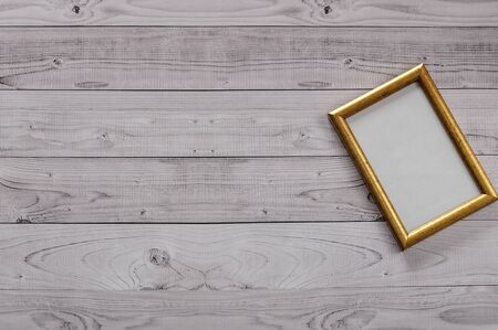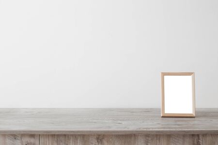 Blank grey vintage wooden frame on table and white wall banckground , banner, with copy space for mock up, template