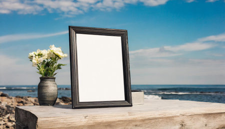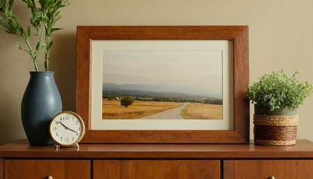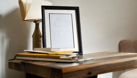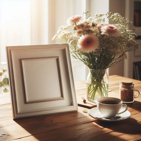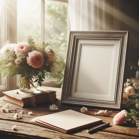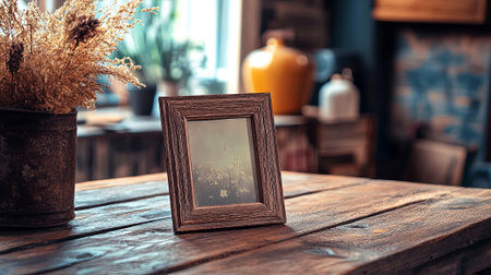 Vintage picture frame sits on rustic wooden table, surrounded by dried flowers and soft natural light, enhancing the cozy ambiance of the interior space, AI generated