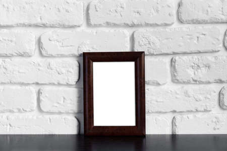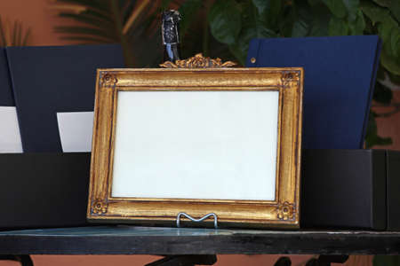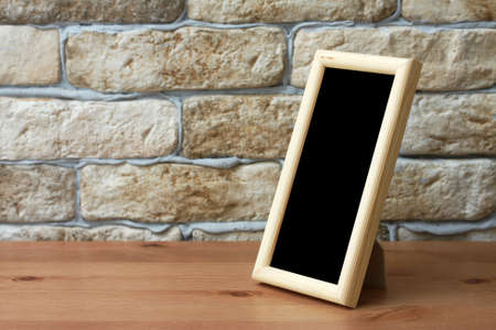 Wooden photo frame hanging on the wall in a cafe. Retro style