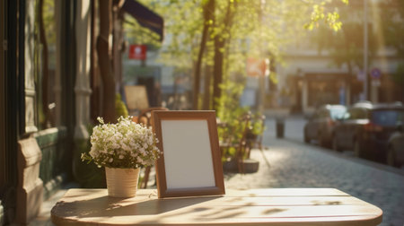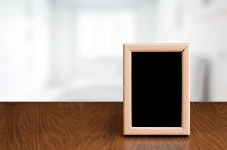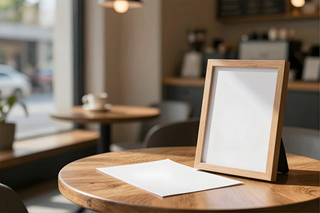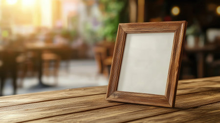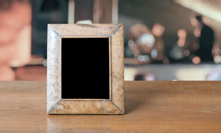 Blank photo frame mockup on wooden table in cafe, stock photo