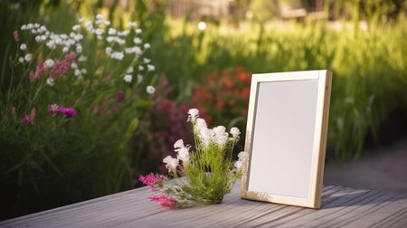 a blank photo frame placed on the wooden floor in the garden full of flowers, a grass and trees background for a mockup photo frame, A nature lifestyle slow life mood.