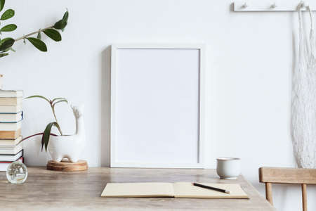 The stylish interior with mock up photo frame, leafs, plant, books, notebooks and lama pot.. The minimalism concept of space.