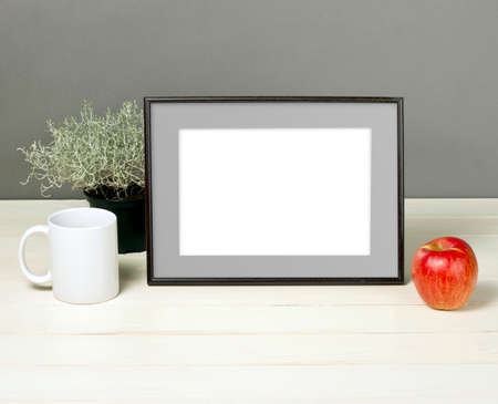 Frame mockup with plant pot, mug and apple on wooden shelf. Empty frame mock up for presentation design. Template framing for modern art.