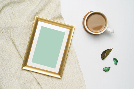Cup of coffee and gold photo frame mock up on brown yarn and white wooden background. Flat lay top view.