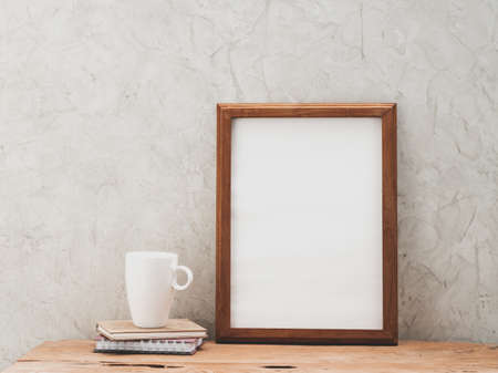Teak wood frame and white coffee cup mock up on grunge table with loft cement wall background